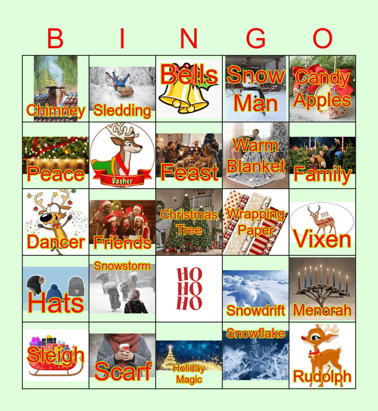 This bingo card has 116 images, a free space and 98 words: Ugly Sweater, Egg Nog, Hot Cocoa, Mistle Toe, Silent Night, Joy, Snow Man, Wreath, Elves, Holly, Ornaments, Snow, Mittens, Candy Cane, Stockings, Presents, Snowglobe, Gingerbread Man, Lights, Sleigh, Bells, Penguin, Polar Bear, Fireplace, Hats, Scarf, Cold, Decorations, Family, Feast, Friends, Fruit Cake, Grinch, Ice Skating, Love, Tinsel, Skiing, Yuletide, Santa, Reindeer, Snowflake, Peace, Kwanzaa, Wrapping Paper, Boxing Day, Sugar Cookies, Caroling, Dreidel, North Pole, Garland, Gingerbread House, Menorah, Nutcracker, Jingle, Poinsettia, Icicles, Star, Dancer, Vixen, Comet, Cupid, Blitzen, Rudolph, Snowstorm, Chimney, Evergreen, Chestnuts, Sledding, Frostbite, Snowdrift, Warm Blanket, Peppermint, Santa’s Workshop, Holiday Parade, Festive Lights, Cookie Exchange, Fuzzy Socks, Crackle, Festive Music, Candy Apples, Holiday Spirit, Snowball Fight, Winter Wonderland, Gingerbread Cookies, Warm Fireplace, Twinkling Lights, Snow Boots, Holiday Cards, Candles, Festive Sweater, Holiday Magic, Carriage Ride, Snowy Night, Cozy Cabin, Frosty Air, Tree Topper, Holiday Feast and Winter Breeze.