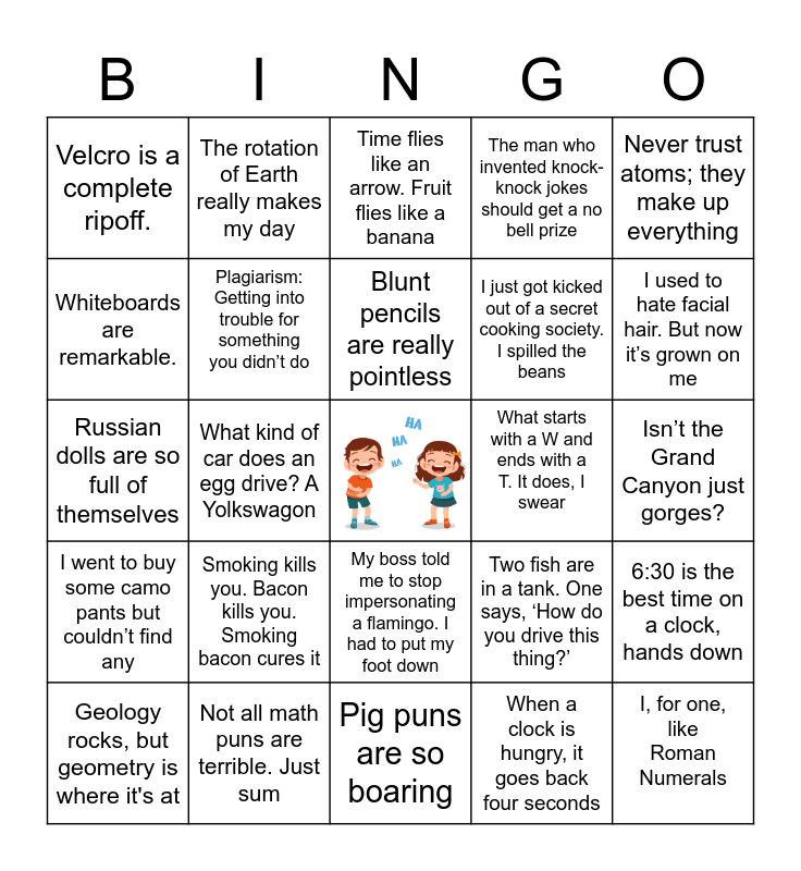This bingo card has a free space and 29 words: Geology rocks, but geometry is where it's at, Just found out the company that produces yardsticks won’t be making them any longer., What kind of car does an egg drive? A Yolkswagon, Bread is a lot like the sun. It rises in the yeast and sets in the waist., Velcro is a complete ripoff., Time flies like an arrow. Fruit flies like a banana, Plagiarism: Getting into trouble for something you didn’t do, Smoking kills you. Bacon kills you. Smoking bacon cures it, What starts with a W and ends with a T. It does, I swear, Not all math puns are terrible. Just sum, Isn’t the Grand Canyon just gorges?, I, for one, like Roman Numerals, Pig puns are so boaring, When a clock is hungry, it goes back four seconds, I used to hate facial hair. But now it’s grown on me, I want to joke about a girl who only eats plants. You’ve probably never heard of herbivore, My boss told me to stop impersonating a flamingo. I had to put my foot down, I went to buy some camo pants but couldn’t find any, Never trust atoms; they make up everything, Russian dolls are so full of themselves, Two fish are in a tank. One says, ‘How do you drive this thing?’, I’m reading a book about anti-gravity. It’s impossible to put down, I just got kicked out of a secret cooking society. I spilled the beans, Whiteboards are remarkable., The man who invented knock-knock jokes should get a no bell prize, The rotation of Earth really makes my day, 6:30 is the best time on a clock, hands down, Blunt pencils are really pointless and It was an emotional wedding. Even the cake was in tiers.