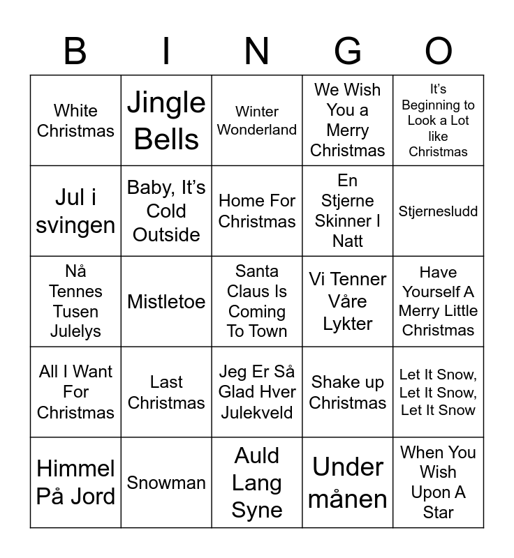 This bingo card has 25 words: Last Christmas, Auld Lang Syne, Home For Christmas, Himmel På Jord, It’s Beginning to Look a Lot like Christmas, White Christmas, Jul i svingen, Jingle Bells, Vi Tenner Våre Lykter, Jeg Er Så Glad Hver Julekveld, En Stjerne Skinner I Natt, Nå Tennes Tusen Julelys, Shake up Christmas, Let It Snow, Let It Snow, Let It Snow, Baby, It’s Cold Outside, When You Wish Upon A Star, Have Yourself A Merry Little Christmas, Winter Wonderland, Stjernesludd, Mistletoe, Santa Claus Is Coming To Town, Snowman, All I Want For Christmas, We Wish You a Merry Christmas and Under månen.