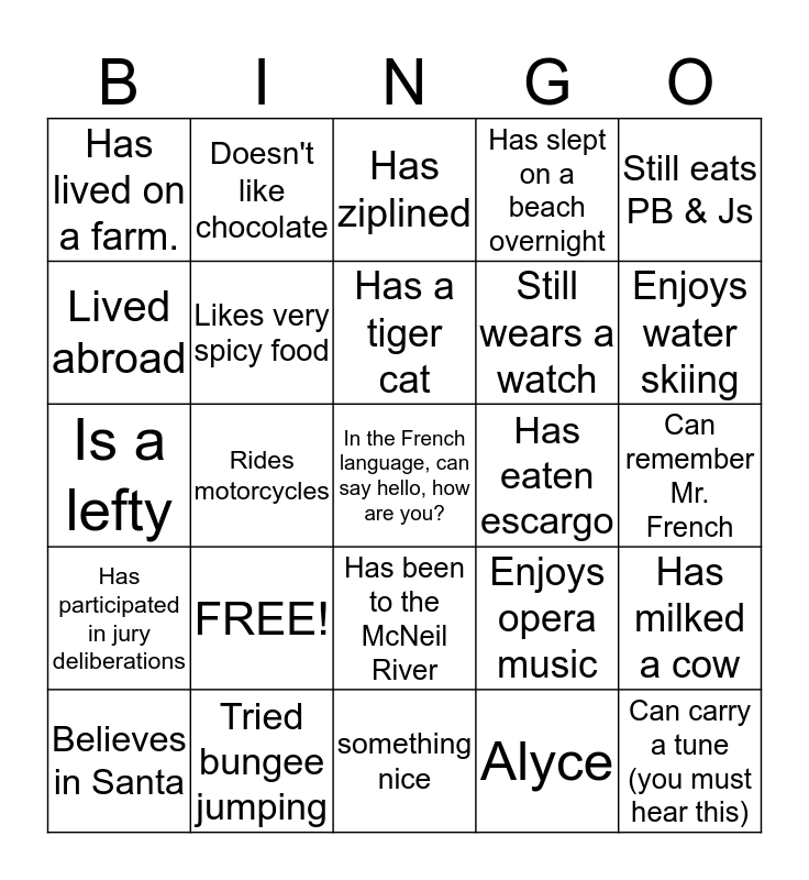 This bingo card has 25 words: FREE!, something nice, Has a tiger cat, Believes in Santa, Still eats PB & Js, Has lived on a farm., Lived abroad, Doesn't like chocolate, Has eaten escargo, Has been to the McNeil River, Still wears a watch, Is a lefty, Enjoys opera music, Has milked a cow, Likes very spicy food, Can carry a tune (you must hear this), Can remember Mr. French, Has ziplined, Enjoys water skiing, Rides motorcycles, In the French language, can say hello, how are you?, Tried bungee jumping, Has participated in jury deliberations, Has slept on a beach overnight and Alyce.