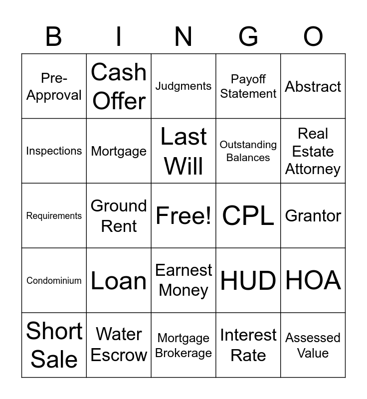 This bingo card has a free space and 24 words: Loan, Water Escrow, Last Will, Short Sale, Abstract, Pre-Approval, Inspections, Cash Offer, CPL, Earnest Money, Outstanding Balances, Requirements, HUD, HOA, Mortgage, Interest Rate, Grantor, Judgments, Real Estate Attorney, Ground Rent, Assessed Value, Condominium, Payoff Statement and Mortgage Brokerage.