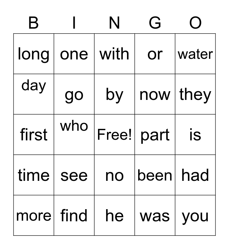 This bingo card has a free space and 29 words: more, the, who, day, long, with, go, see, part, find, is, you, he, was, they, write, no, time, water, first, been, called, now, day, or, one, had, by and do.