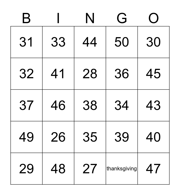 This bingo card has a free space and 25 words: 26, 27, 28, 29, 30, 31, 32, 33, 34, 35, 36, 37, 39, 40, 41, 42, 43, 44, 45, 46, 47, 48, 49, 50 and thanksgiving.