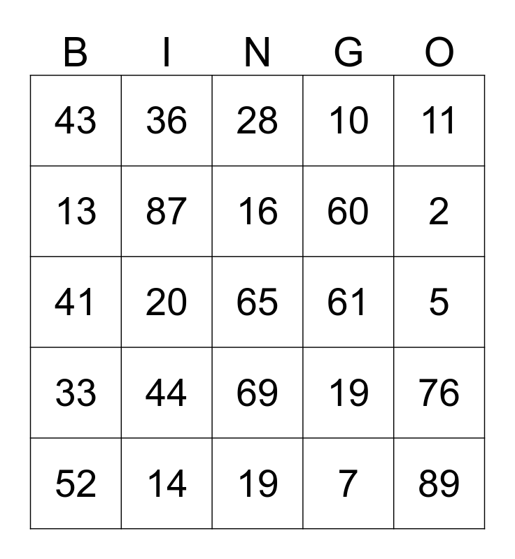 This bingo card has a free space and 24 words: 44, 14, 16, 52, 11, 43, 13, 36, 61, 69, 60, 41, 19, 76, 87, 7, 5, 28, 2, 20, 89, 33, 10 and 19.