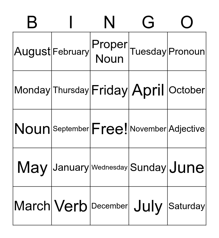 This bingo card has a free space and 24 words: January, Verb, Friday, March, Pronoun, August, Monday, February, November, Wednesday, April, Noun, Sunday, June, Thursday, July, Adjective, Proper Noun, October, September, Saturday, May, Tuesday and December.