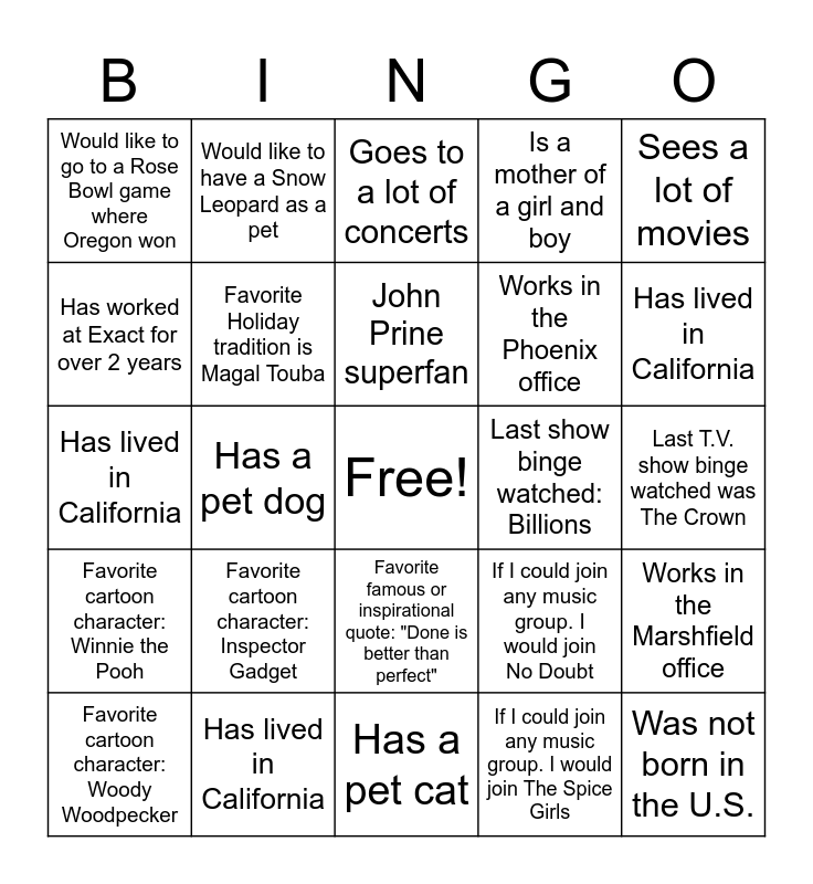This bingo card has a free space and 24 words: Favorite cartoon character: Inspector Gadget, Has lived in California, John Prine superfan, Favorite cartoon character: Woody Woodpecker, Sees a lot of movies, Would like to go to a Rose Bowl game where Oregon won, Has worked at Exact for over 2 years, Would like to have a Snow Leopard as a pet, Last show binge watched: Billions, Favorite famous or inspirational quote: "Done is better than perfect", Works in the Phoenix office, Has lived in California, If I could join any music group. I would join No Doubt, Works in the Marshfield office, Favorite Holiday tradition is Magal Touba, If I could join any music group. I would join The Spice Girls, Last T.V. show binge watched was The Crown, Goes to a lot of concerts, Has lived in California, Has a pet dog, Was not born in the U.S., Favorite cartoon character: Winnie the Pooh, Is a mother of a girl and boy and Has a pet cat.