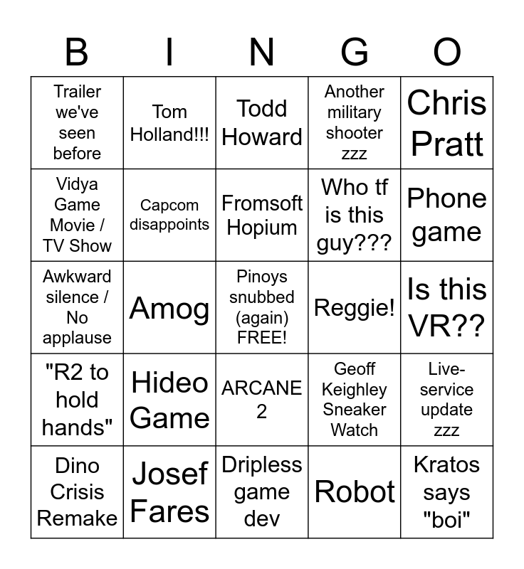 This bingo card has a free space and 24 words: Hideo Game, Josef Fares, Fromsoft Hopium, Dino Crisis Remake, Chris Pratt, Trailer we've seen before, Vidya Game Movie / TV Show, Tom Holland!!!, Reggie!, ARCANE 2, Who tf is this guy???, Awkward silence / No applause, Geoff Keighley Sneaker Watch, Live-service update zzz, Capcom disappoints, Robot, Is this VR??, Todd Howard, Phone game, Amog, Kratos says "boi", "R2 to hold hands", Another military shooter zzz and Dripless game dev.