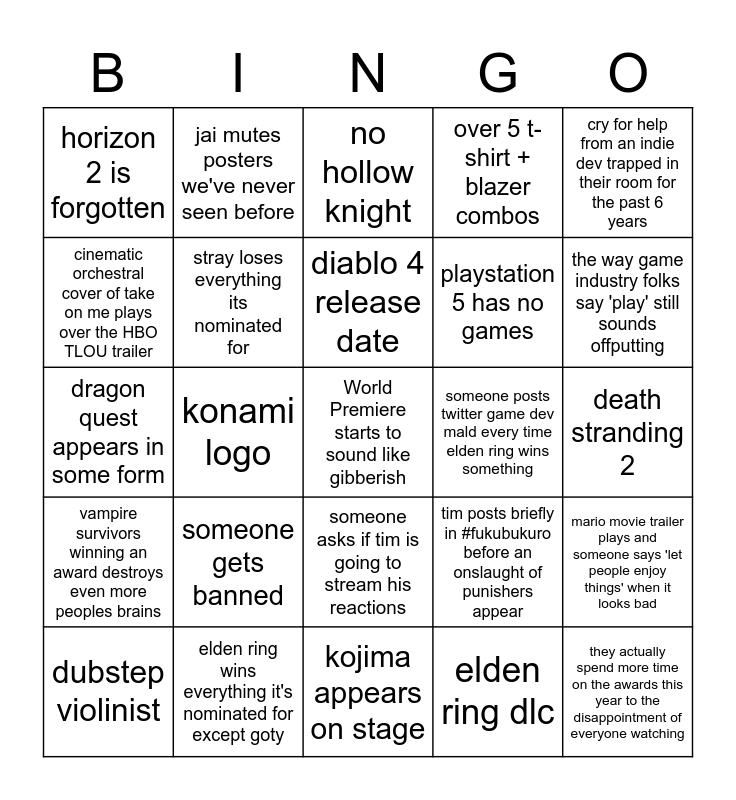 This bingo card has a free space and 24 words: someone gets banned, elden ring wins everything it's nominated for except goty, diablo 4 release date, dubstep violinist, cry for help from an indie dev trapped in their room for the past 6 years, horizon 2 is forgotten, cinematic orchestral cover of take on me plays over the HBO TLOU trailer, jai mutes posters we've never seen before, someone posts twitter game dev mald every time elden ring wins something, someone asks if tim is going to stream his reactions, playstation 5 has no games, dragon quest appears in some form, tim posts briefly in #fukubukuro before an onslaught of punishers appear, mario movie trailer plays and someone says 'let people enjoy things' when it looks bad, stray loses everything its nominated for, elden ring dlc, death stranding 2, no hollow knight, the way game industry folks say 'play' still sounds offputting, konami logo, they actually spend more time on the awards this year to the disappointment of everyone watching, vampire survivors winning an award destroys even more peoples brains, over 5 t-shirt + blazer combos and kojima appears on stage.