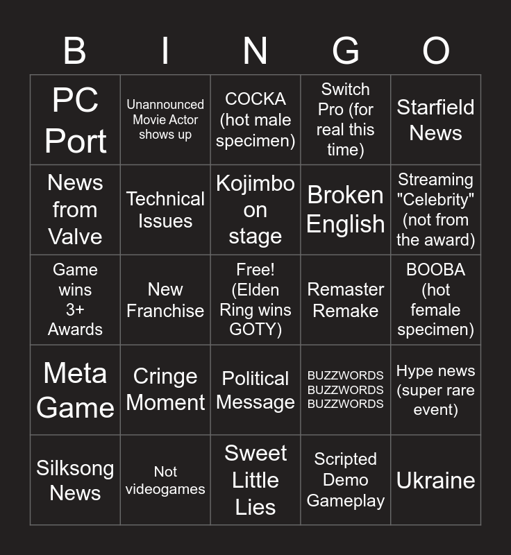 This bingo card has a free space and 24 words: Cringe Moment, Not videogames, Kojimbo on stage, Silksong News, Starfield News, PC Port, News from Valve, Unannounced Movie Actor shows up, Remaster Remake, Political Message, Broken English, Game wins 3+ Awards, BUZZWORDS BUZZWORDS BUZZWORDS, Hype news (super rare event), Technical Issues, Scripted Demo Gameplay, BOOBA (hot female specimen), COCKA (hot male specimen), Streaming "Celebrity" (not from the award), New Franchise, Ukraine, Meta Game, Switch Pro (for real this time) and Sweet Little Lies.