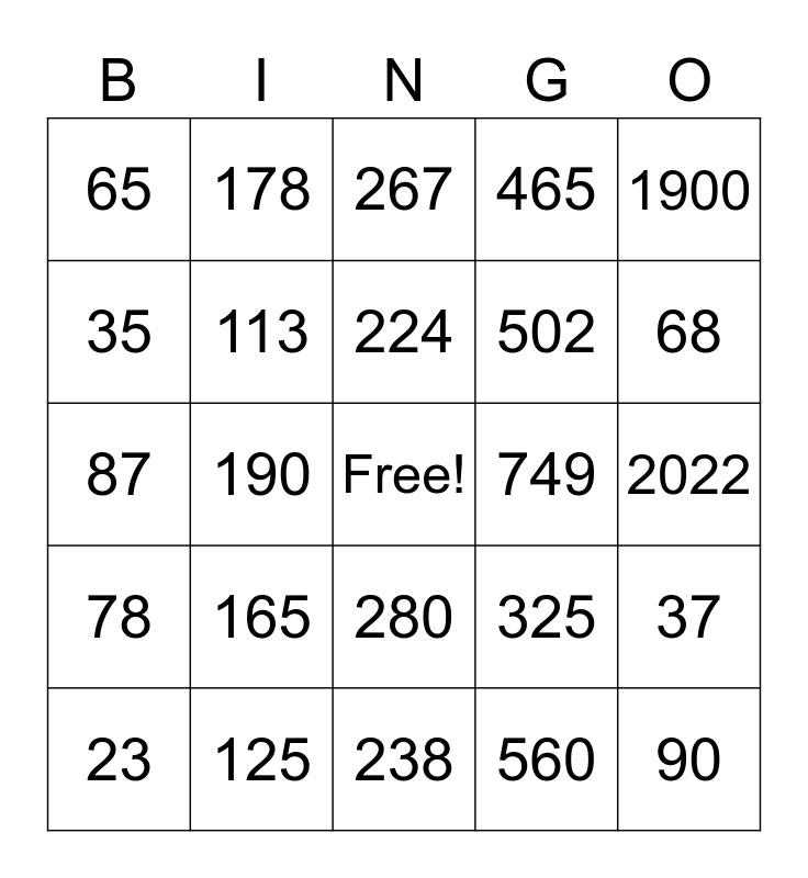 This bingo card has a free space and 24 words: 23, 165, 224, 560, 1900, 65, 178, 267, 749, 2022, 87, 113, 325, 37, 35, 125, 238, 465, 68, 78, 190, 280, 502 and 90.