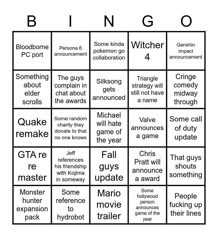This bingo card has a free space and 24 words: Jeff references his friendship with Kojima in someway, Some reference to hydrobot, Silksong gets announced, Monster hunter expansion pack, Genshin impact announcement, Bloodborne PC port, Something about elder scrolls, Persona 6 announcement, Valve announces a game, Fall guys update, Triangle strategy will still not have a name, Quake remake, Chris Pratt will announce a award, That guys shouts something, The guys complain in chat about the awards, Some hollywood person announces game of the year, Some call of duty update, Some kinda pokemon go collaboration, Cringe comedy midway through, Some random charity they donate to that no one knows, People fucking up their lines, GTA re re master, Witcher 4 and Mario movie trailer.