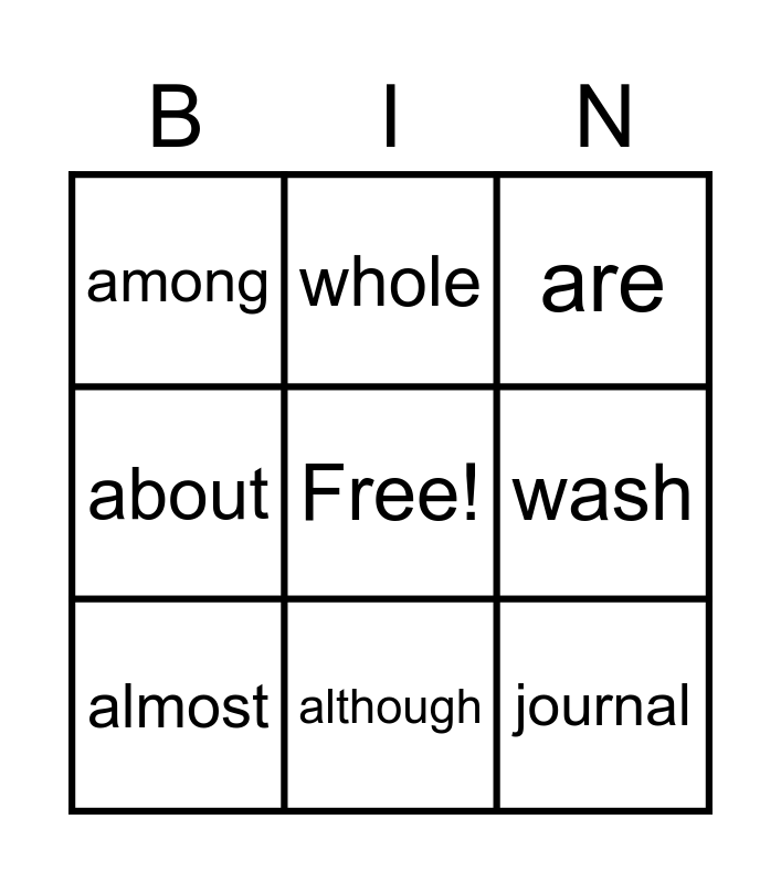 This bingo card has a free space and 27 words: were, our, every, come, wash, are, whole, through, laugh, world, any, about, above, again, against, all, almost, although, always, among, another, answer, minute, said, sure, journal and month.