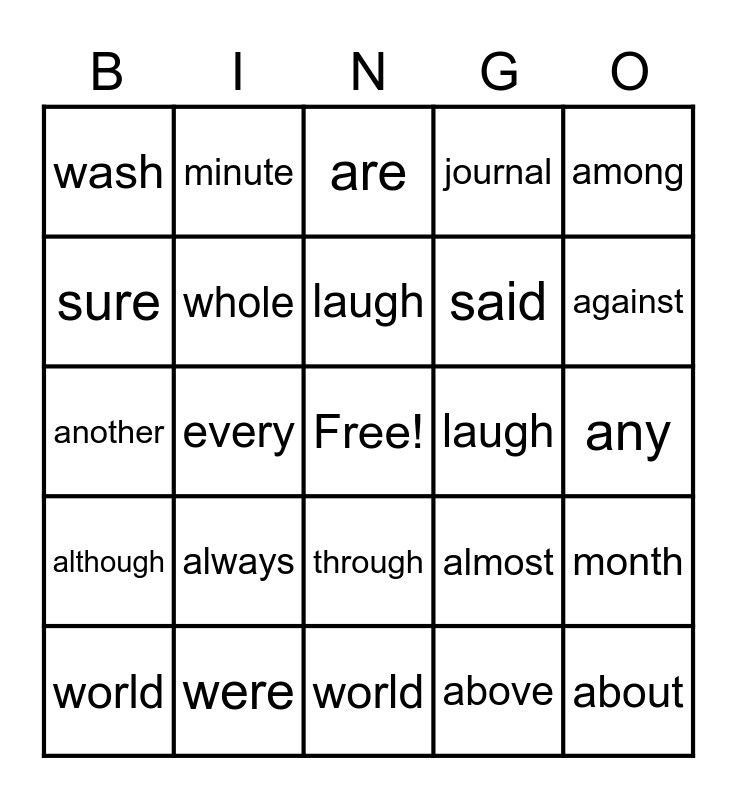 This bingo card has a free space and 30 words: were, our, every, come, wash, are, whole, through, laugh, world, any, about, above, again, against, all, almost, although, always, among, another, answer, minute, said, sure, journal, month, world, laugh and whole.
