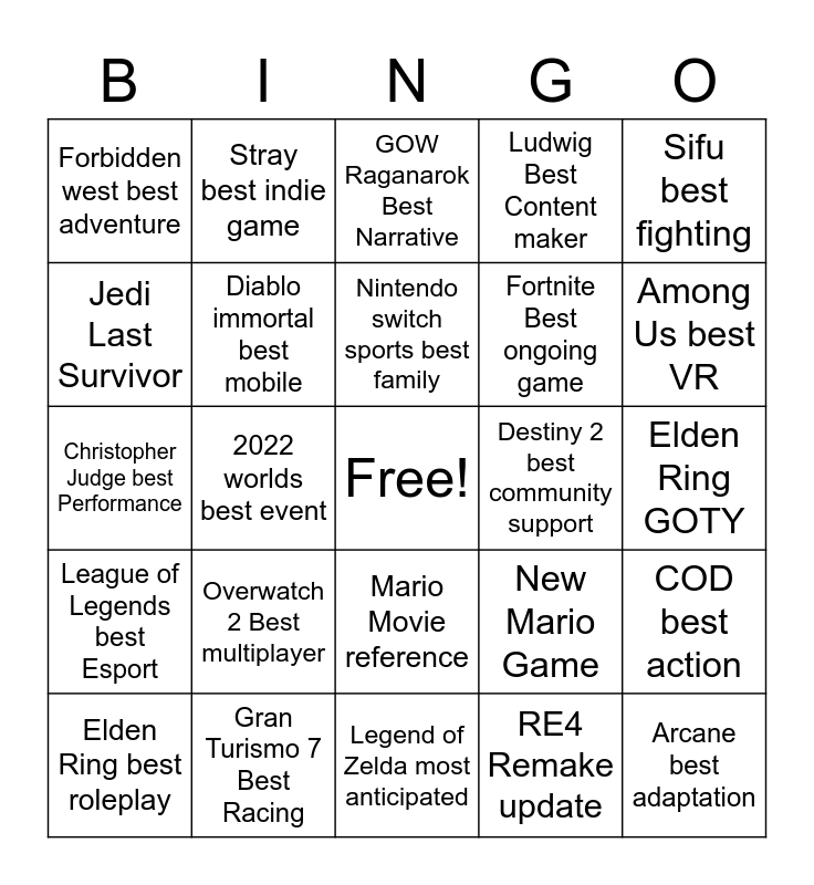 This bingo card has a free space and 24 words: Overwatch 2 Best multiplayer, Gran Turismo 7 Best Racing, Nintendo switch sports best family, Elden Ring best roleplay, Sifu best fighting, Forbidden west best adventure, Jedi Last Survivor, Stray best indie game, Destiny 2 best community support, Mario Movie reference, Fortnite Best ongoing game, Christopher Judge best Performance, New Mario Game, COD best action, Diablo immortal best mobile, RE4 Remake update, Elden Ring GOTY, GOW Raganarok Best Narrative, Among Us best VR, 2022 worlds best event, Arcane best adaptation, League of Legends best Esport, Ludwig Best Content maker and Legend of Zelda most anticipated.