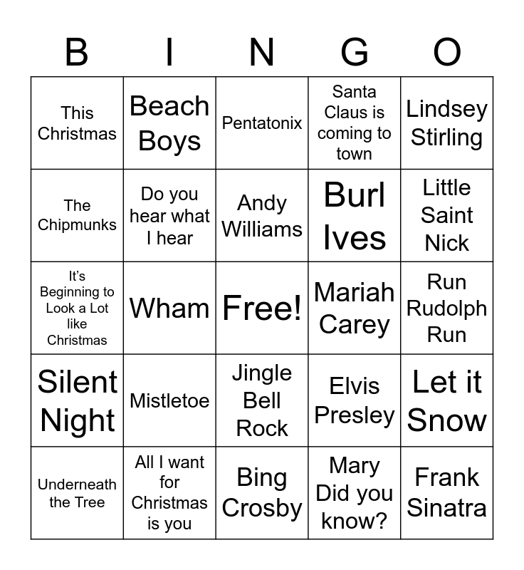 This bingo card has a free space and 43 words: Jingle Bells, Frank Sinatra, White Christmas, Underneath the Tree, Kelly Clarkson, Mary Did you know?, Pentatonix, Carol of the Bells, Lindsey Stirling, All I want for Christmas is you, Santa Claus is coming to town, Mariah Carey, Jingle Bell Rock, Mistletoe, Justin Bieber, Bing Crosby, A Holly Jolly Christmas, It’s Beginning to Look a Lot like Christmas, The Little Drummer Boy, Little Saint Nick, Beach Boys, The Chipmunk Song, Dean Martin, This Christmas, Rockin Around the Christmas Tree, Run Rudolph Run, Chuck Berry, Blue Christmas, Elvis Presley, Silent Night, Sam Smith, Let it Snow, Last Christmas, Wham, The Temptations, Bruce Springsteen, It’s the most wonderful time of the year, Andy Williams, The Chipmunks, Burl Ives, Have Yourself a Merry Little Christmas, Do you hear what I hear and Carrie Underwood.