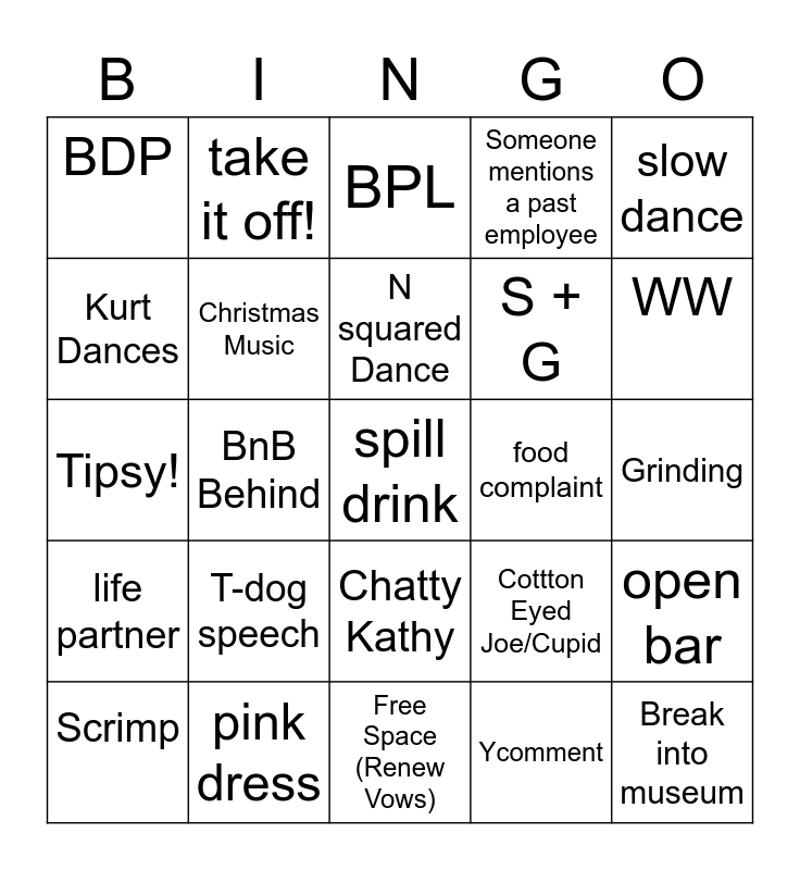This bingo card has 25 words: life partner, pink dress, spill drink, Ycomment, slow dance, BDP, take it off!, BPL, food complaint, open bar, Kurt Dances, Christmas Music, Free Space (Renew Vows), Cottton Eyed Joe/Cupid, WW, Scrimp, BnB Behind, N squared Dance, S + G, Grinding, Tipsy!, T-dog speech, Chatty Kathy, Someone mentions a past employee and Break into museum.
