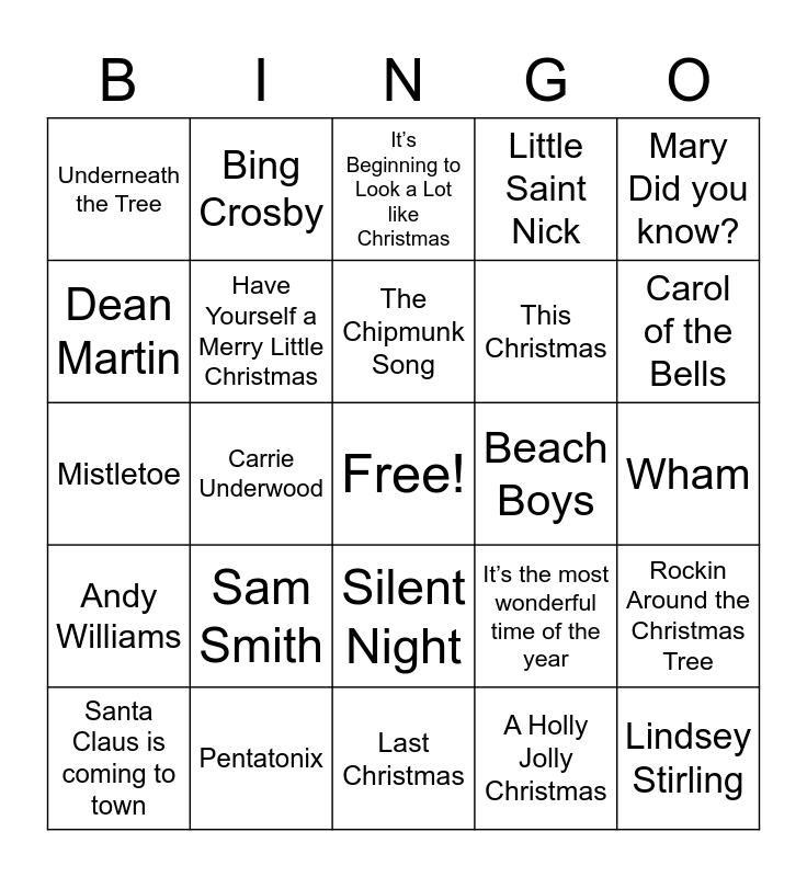 This bingo card has a free space and 43 words: Jingle Bells, Lindsey Stirling, All I want for Christmas is you, Santa Claus is coming to town, Mariah Carey, A Holly Jolly Christmas, It’s Beginning to Look a Lot like Christmas, The Little Drummer Boy, Mary Did you know?, Pentatonix, Little Saint Nick, Beach Boys, Silent Night, Sam Smith, Let it Snow, Last Christmas, Jingle Bell Rock, Mistletoe, Justin Bieber, Carol of the Bells, Bing Crosby, Frank Sinatra, White Christmas, Underneath the Tree, Kelly Clarkson, Wham, The Temptations, Bruce Springsteen, It’s the most wonderful time of the year, Andy Williams, The Chipmunks, Rockin Around the Christmas Tree, Run Rudolph Run, Carrie Underwood, Chuck Berry, Blue Christmas, Elvis Presley, The Chipmunk Song, Dean Martin, This Christmas, Burl Ives, Have Yourself a Merry Little Christmas and Do you hear what I hear.