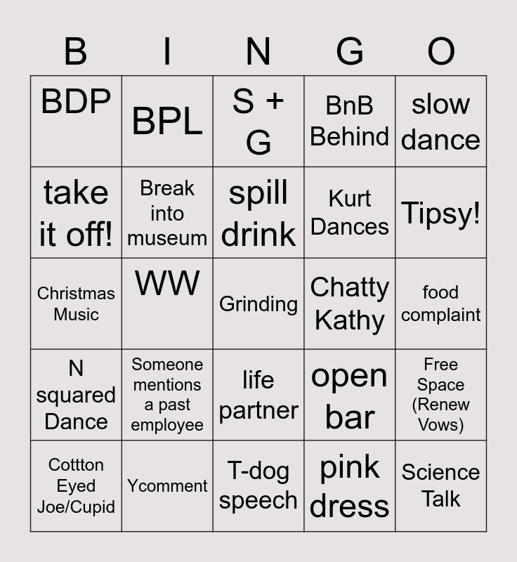 This bingo card has 26 words: life partner, pink dress, spill drink, Ycomment, slow dance, BDP, take it off!, BPL, food complaint, open bar, Kurt Dances, Christmas Music, Free Space (Renew Vows), Cottton Eyed Joe/Cupid, WW, Scrimp, BnB Behind, N squared Dance, S + G, Grinding, Tipsy!, T-dog speech, Chatty Kathy, Someone mentions a past employee, Break into museum and Science Talk.