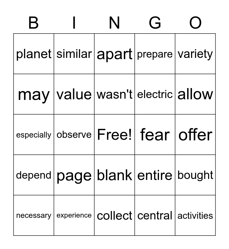 This bingo card has a free space and 24 words: page, experience, wasn't, necessary, variety, planet, may, similar, fear, blank, electric, especially, entire, bought, value, central, offer, apart, allow, observe, activities, depend, prepare and collect.