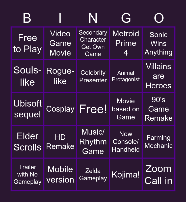 This bingo card has a free space and 24 words: HD Remake, Mobile version, Celebrity Presenter, Trailer with No Gameplay, Sonic Wins Anything, Free to Play, Souls-like, Video Game Movie, Movie based on Game, Music/ Rhythm Game, Animal Protagonist, Ubisoft sequel, New Console/ Handheld, Farming Mechanic, Rogue-like, Kojima!, 90's Game Remake, Secondary Character Get Own Game, Villains are Heroes, Cosplay, Zoom Call in, Elder Scrolls, Metroid Prime 4 and Zelda Gameplay.