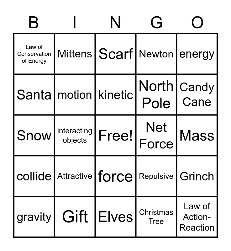 This bingo card has 3 images, a free space and 36 words: motion, gravity, force, kinetic, Potential, energy, collide, interacting objects, Newton, Law of Action-Reaction, Mass, Net Force, Attractive, Weight, Law of Conservation of Energy, System, Repulsive, Santa, Elves, North Pole, Candy Cane, Rudolph, Mistletoe, Wreath, Ornaments, Sleigh, Mittens, Nutcracker, Gingerbread, Scarf, Gift, Christmas Tree, Snowman, Grinch, Snow and Lights.