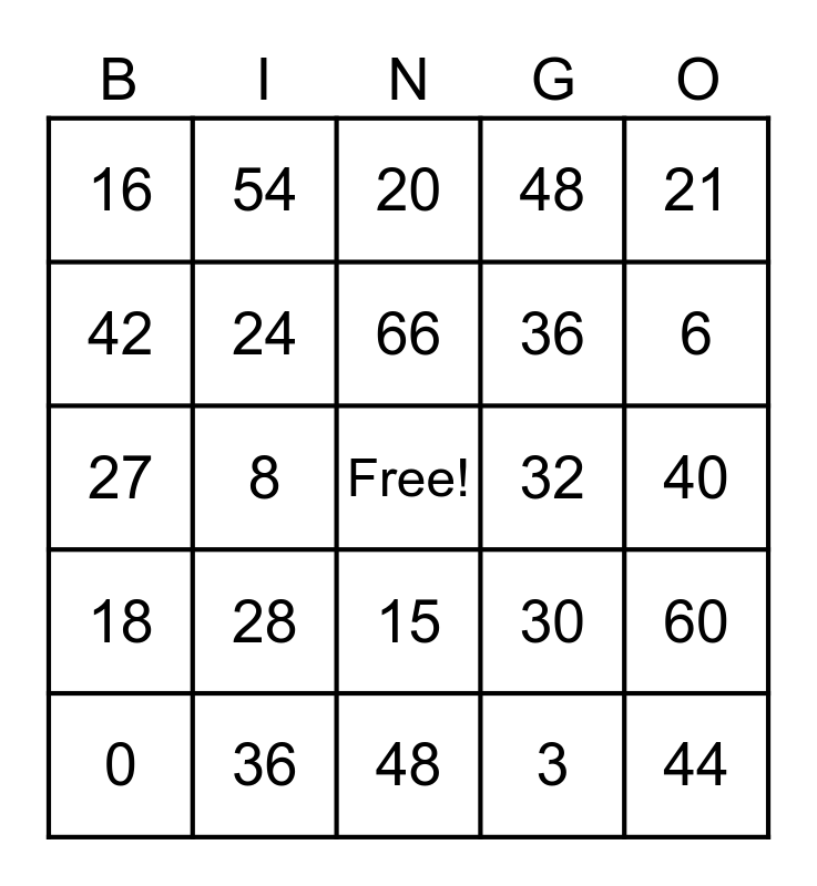 This bingo card has a free space and 29 words: 0, 4, 8, 12, 16, 20, 24, 28, 32, 36, 40, 44, 48, 3, 6, 9, 15, 18, 21, 27, 30, 33, 36, 42, 48, 54, 60, 66 and 72.
