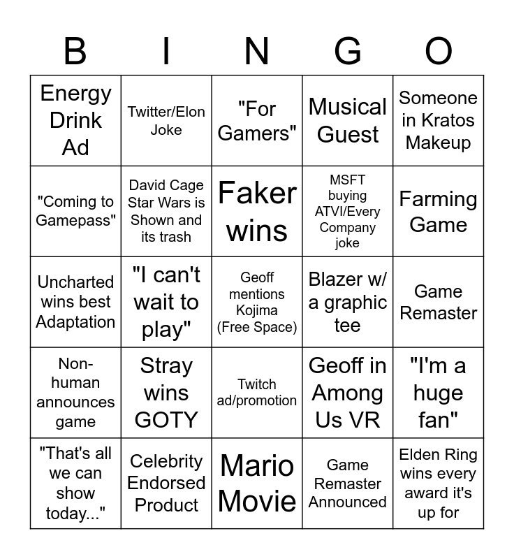 This bingo card has a free space and 24 words: "That's all we can show today...", Stray wins GOTY, Faker wins, Game Remaster Announced, Someone in Kratos Makeup, Energy Drink Ad, Twitter/Elon Joke, "For Gamers", Blazer w/ a graphic tee, Game Remaster, Uncharted wins best Adaptation, David Cage Star Wars is Shown and its trash, Geoff in Among Us VR, "I'm a huge fan", "Coming to Gamepass", Celebrity Endorsed Product, Mario Movie, Musical Guest, Farming Game, Non-human announces game, "I can't wait to play", Twitch ad/promotion, MSFT buying ATVI/Every Company joke and Elden Ring wins every award it's up for.