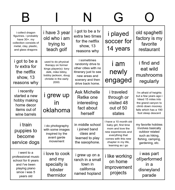This bingo card has a free space and 24 words: i do photography with some images inspired by the avant garde movement, i love to cook and my specialty is lobster thermidor, i sometimes randomly drive to other cities with no itinerary just to see new areas and scenery and then drive back home., i went to a professional music school for 6 years and i've been playing piano since i was 5 years old, old spaghetti factory is my favorite restaurant, i collect dragon figurines. i probably have 30+. my collection consists of metal, clay, plastic, and glass dragons, i got to be a tv extra for the netflix show, 13 reasons why, i have 3 year old who i am trying to teach golf, i traveled through or visited 48 out of 50 states, in middle school i joined band class and learned to play the saxophone., i am newly engaged, i recently started a new hobby making home decor items out of wine barrels, I have a 10 month old baby girl, first time mom and love the new experiences and everything that comes with this new chapter in my life, learning as i go, my favorite hobbies involves basically outdoor related such as hiking, fishing, camping, gardening, etc., used to do physical therapy on former kings player(s): tony delk, mike bibby, bobby jackson, doug christie in the early 2000., i like working on home improvement projects, i'm afraid of heights but a few years ago i hiked 15 miles into the grand canyon to climb down mooney falls which has a 190 foot steep descent, i got to be a tv extra two times for the netflix show, 13 reasons why, i find and eat wild mushrooms regularly, i grew up in oklahoma, i was part of/performed in a disneyland parade, i train puppies to become service dogs, i played soccer for 14 years and i grew up on a ranch in a small town in california named hopland.