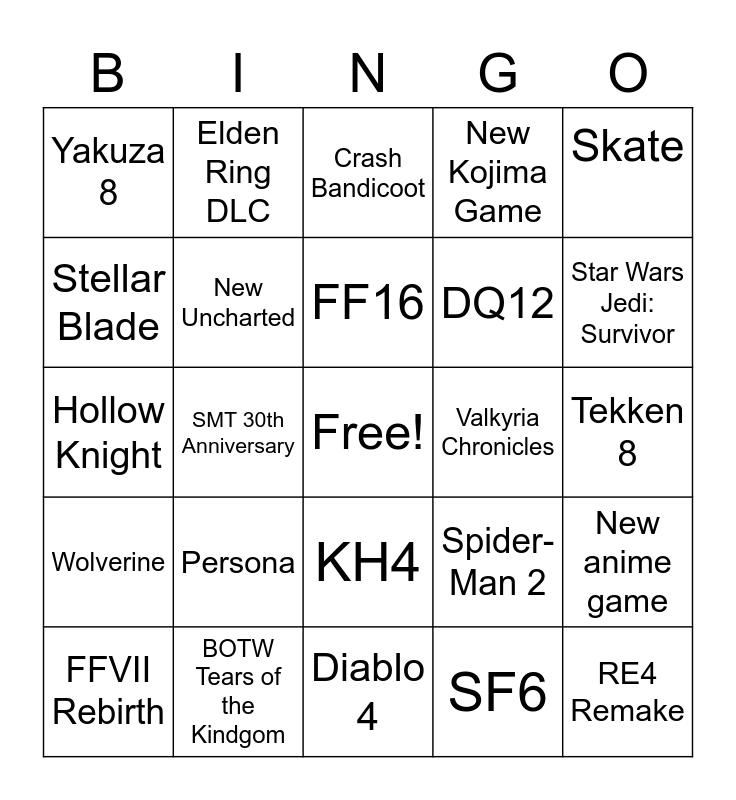 This bingo card has a free space and 24 words: Persona, BOTW Tears of the Kindgom, FF16, FFVII Rebirth, Skate, Yakuza 8, Stellar Blade, Elden Ring DLC, Valkyria Chronicles, KH4, DQ12, Hollow Knight, Spider-Man 2, New anime game, New Uncharted, SF6, Tekken 8, Crash Bandicoot, Star Wars Jedi: Survivor, SMT 30th Anniversary, RE4 Remake, Wolverine, New Kojima Game and Diablo 4.