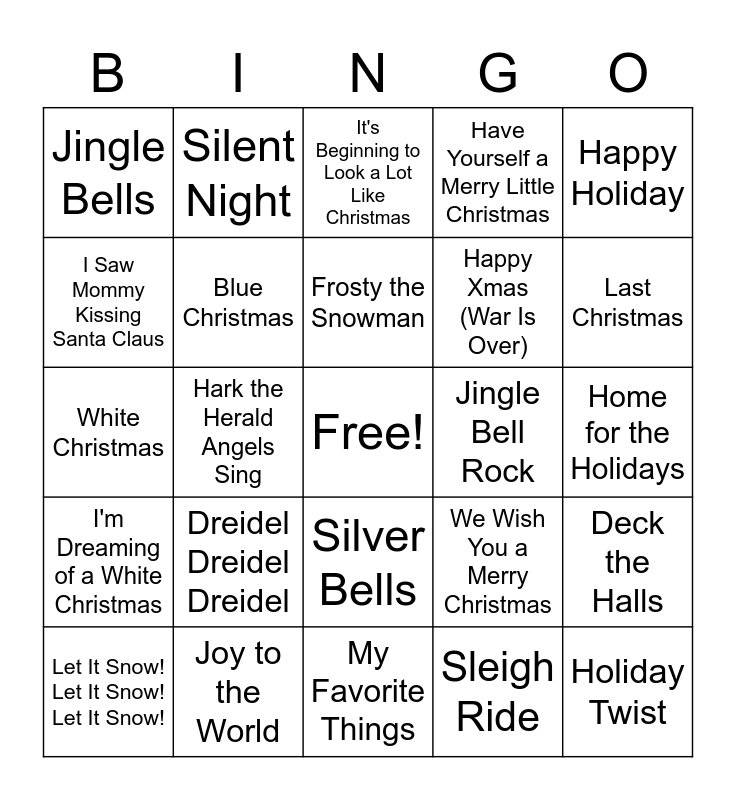 This bingo card has a free space and 38 words: All I Want for Christmas is My Two Front Teeth, All I Want for Christmas is You, Baby, It's Cold Outside, Blue Christmas, Deck the Halls, Dreidel Dreidel Dreidel, Frosty the Snowman, Grandma Got Run Over by A Reindeer, Happy Holiday, Happy Xmas (War Is Over), Hark the Herald Angels Sing, Have Yourself a Merry Little Christmas, Holiday Twist, Home for the Holidays, I Saw Mommy Kissing Santa Claus, I'm Dreaming of a White Christmas, I'll be Home for Christmas, It's Beginning to Look a Lot Like Christmas, It's the Most Wonderful Time of the Year, Jingle Bell Rock, Jingle Bells, Joy to the World, Last Christmas, Let It Snow! Let It Snow! Let It Snow!, Little Drummer Boy, My Favorite Things, Rockin' Around the Christmas Tree, Rudolph, the Red-nosed Reindeer, Run Rudolph Run, Santa Claus is Coming to Town, Santa Baby, Silver Bells, Sleigh Ride, Silent Night, The Twelve Days of Christmas, We Wish You a Merry Christmas, White Christmas and Winter Wonderland.