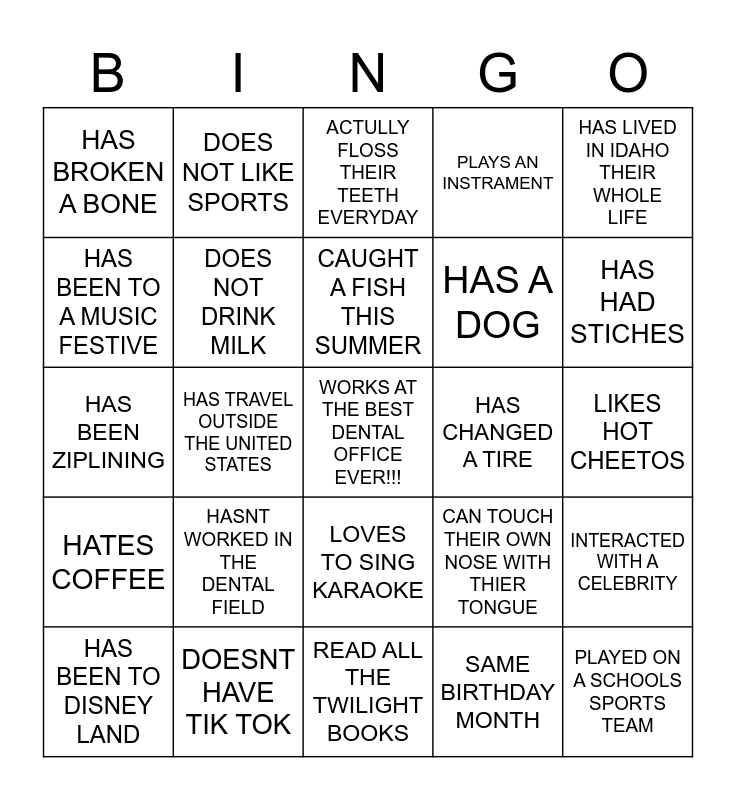 This bingo card has a free space and 24 words: HASNT WORKED IN THE DENTAL FIELD, DOESNT HAVE TIK TOK, CAUGHT A FISH THIS SUMMER, HAS BEEN TO DISNEY LAND, HAS LIVED IN IDAHO THEIR WHOLE LIFE, HAS BROKEN A BONE, HAS BEEN TO A MUSIC FESTIVE, DOES NOT LIKE SPORTS, HAS CHANGED A TIRE, LOVES TO SING KARAOKE, HAS A DOG, HAS BEEN ZIPLINING, CAN TOUCH THEIR OWN NOSE WITH THIER TONGUE, INTERACTED WITH A CELEBRITY, DOES NOT DRINK MILK, SAME BIRTHDAY MONTH, LIKES HOT CHEETOS, ACTULLY FLOSS THEIR TEETH EVERYDAY, HAS HAD STICHES, HAS TRAVEL OUTSIDE THE UNITED STATES, PLAYED ON A SCHOOLS SPORTS TEAM, HATES COFFEE, PLAYS AN INSTRAMENT and READ ALL THE TWILIGHT BOOKS.