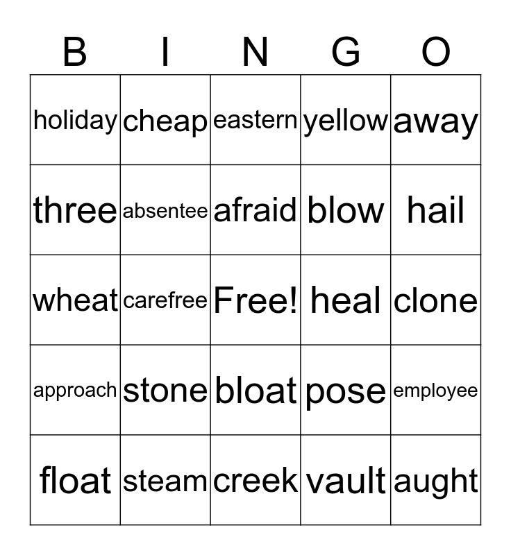 This bingo card has a free space and 24 words: stone, steam, afraid, float, away, holiday, three, cheap, heal, bloat, blow, wheat, pose, employee, absentee, vault, clone, eastern, hail, carefree, aught, approach, yellow and creek.
