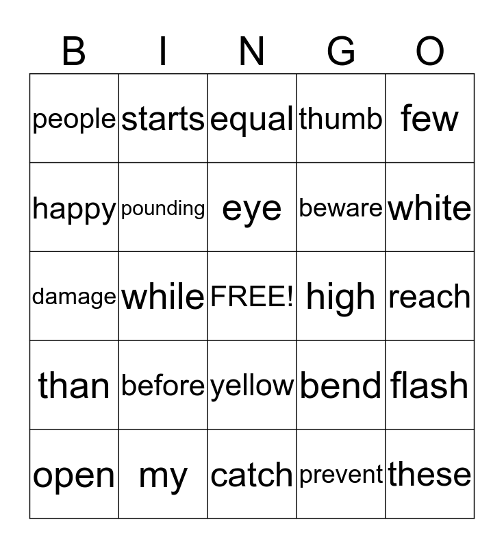 This bingo card has a free space and 24 words: before, my, eye, open, few, people, happy, starts, high, yellow, beware, damage, bend, flash, pounding, prevent, reach, equal, white, while, these, than, thumb and catch.