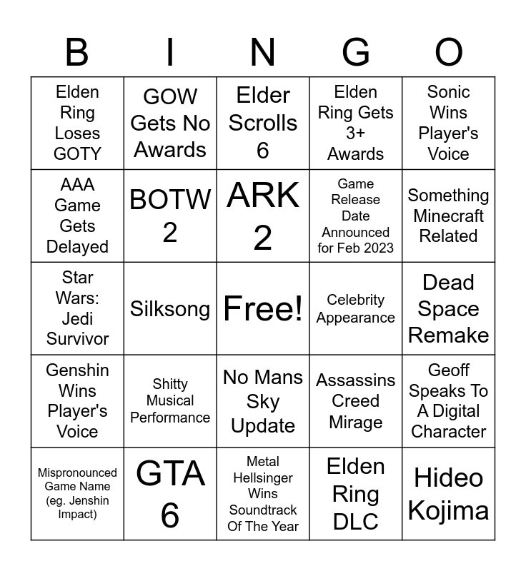 This bingo card has a free space and 29 words: Mispronounced Game Name (eg. Jenshin Impact), Bloodborne PC Port, Silksong, Among Us 2, Elden Ring Loses GOTY, Elder Scrolls 6, BOTW 2, Shitty Musical Performance, Celebrity Appearance, GTA 6, Dead Space Remake, Hideo Kojima, Metal Hellsinger Wins Soundtrack Of The Year, Elden Ring DLC, Something Minecraft Related, Starfield Trailer That Tells Us Literally Nothing, No Mans Sky Update, Genshin Wins Player's Voice, Sonic Wins Player's Voice, Star Wars: Jedi Survivor, Assassins Creed Mirage, Geoff Keighley Says Something Cringe, Game Release Date Announced for Feb 2023, AAA Game Gets Delayed, Elden Ring Gets 3+ Awards, GOW Gets No Awards, Geoff Speaks To A Digital Character, ARK 2 and Video Game TV Show Spinoff.