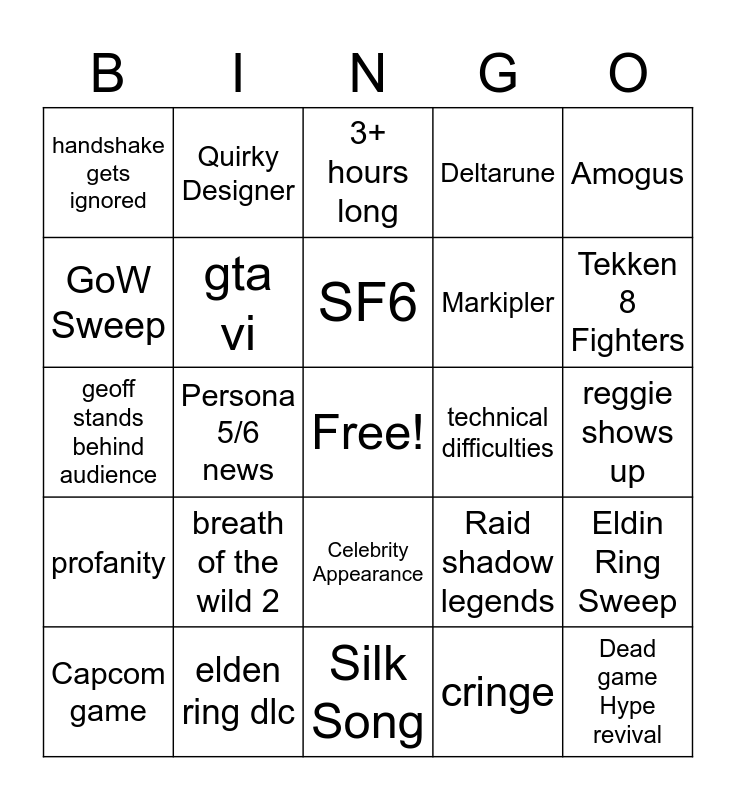 This bingo card has a free space and 24 words: breath of the wild 2, elden ring dlc, SF6, Capcom game, Amogus, handshake gets ignored, GoW Sweep, Quirky Designer, technical difficulties, Celebrity Appearance, Markipler, geoff stands behind audience, Raid shadow legends, Eldin Ring Sweep, gta vi, cringe, reggie shows up, 3+ hours long, Tekken 8 Fighters, Persona 5/6 news, Dead game Hype revival, profanity, Deltarune and Silk Song.