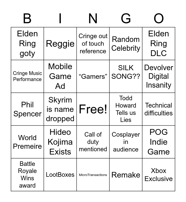 This bingo card has a free space and 24 words: Hideo Kojima Exists, LootBoxes, “Gamers”, Battle Royale Wins award, Elden Ring DLC, Elden Ring goty, Cringe Music Performance, Reggie, Todd Howard Tells us Lies, Call of duty mentioned, SILK SONG??, Phil Spencer, Cosplayer in audience, POG Indie Game, Mobile Game Ad, Remake, Technical difficulties, Cringe out of touch reference, Devolver Digital Insanity, Skyrim is name dropped, Xbox Exclusive, World Premeire, Random Celebrity and MicroTransactions.