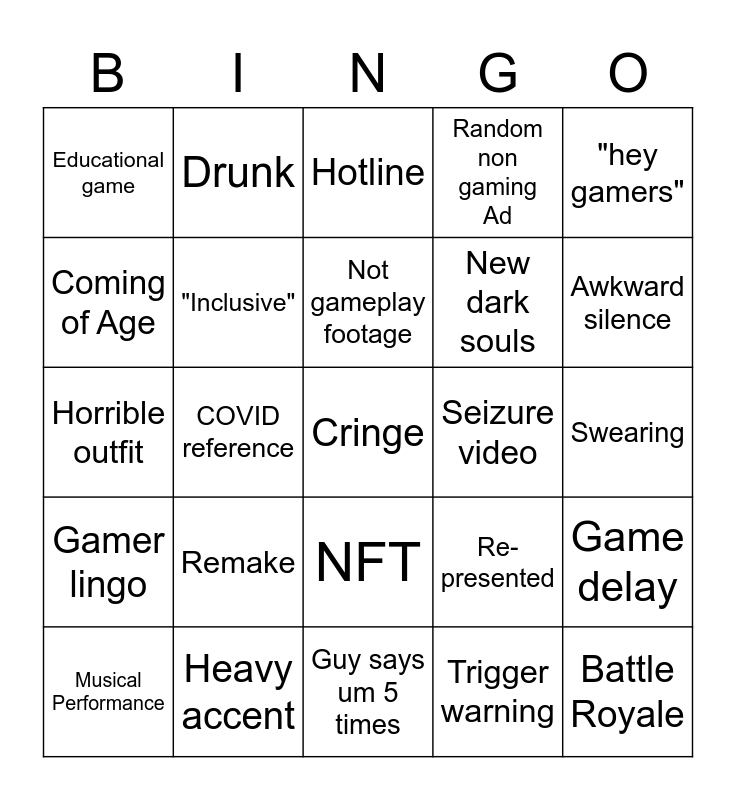 This bingo card has a free space and 24 words: Remake, Heavy accent, Not gameplay footage, Musical Performance, "hey gamers", Educational game, Coming of Age, Drunk, Seizure video, NFT, New dark souls, Horrible outfit, Re-presented, Game delay, "Inclusive", Trigger warning, Swearing, Hotline, Awkward silence, COVID reference, Battle Royale, Gamer lingo, Random non gaming Ad and Guy says um 5 times.