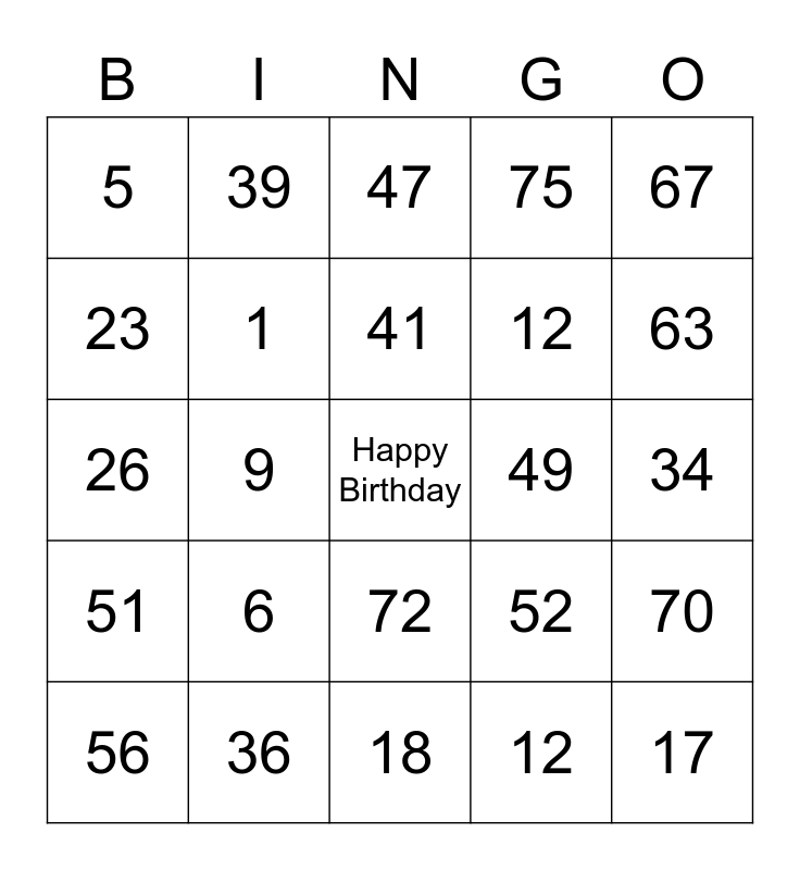 This bingo card has a free space and 25 words: 6, 18, 41, 56, 67, 5, 23, 39, 49, 72, 12, 26, 52, 70, 1, 28, 34, 47, 63, 9, 17, 36, 51, 75 and 12.