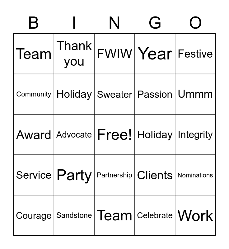 This bingo card has a free space and 24 words: Party, Sandstone, Sweater, Courage, Festive, Team, Community, Thank you, Holiday, Partnership, Passion, Award, Clients, Nominations, Holiday, Celebrate, Integrity, FWIW, Ummm, Advocate, Work, Service, Year and Team.