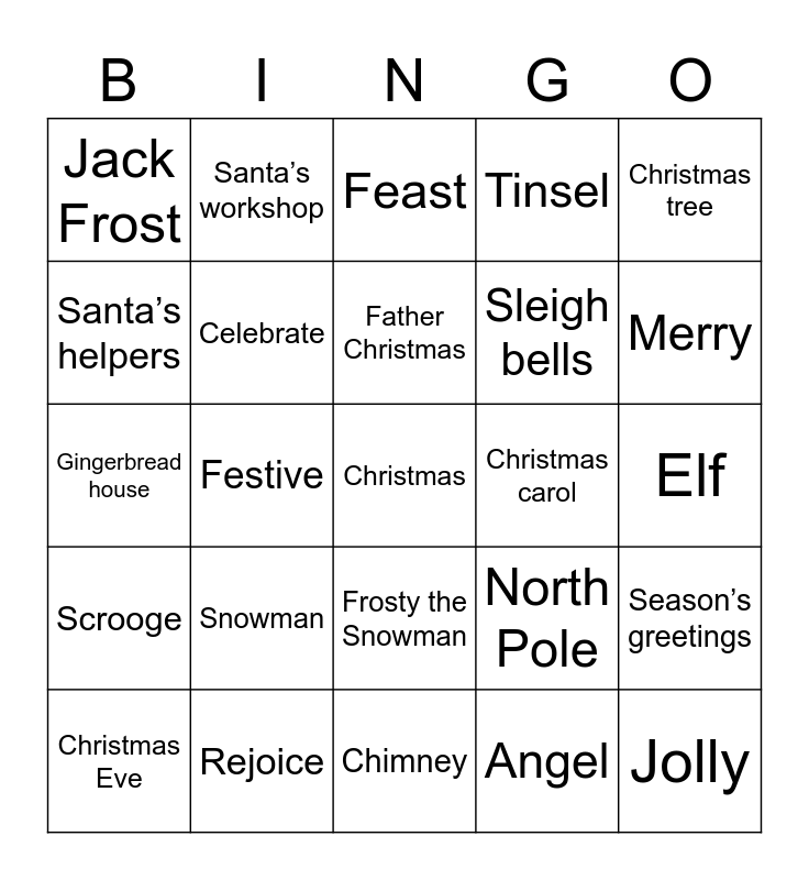 This bingo card has a free space and 24 words: Snowman, Rejoice, Father Christmas, Christmas Eve, Christmas tree, Jack Frost, Santa’s helpers, Santa’s workshop, Christmas carol, Frosty the Snowman, Sleigh bells, Gingerbread house, North Pole, Season’s greetings, Celebrate, Angel, Elf, Feast, Merry, Festive, Jolly, Scrooge, Tinsel and Chimney.