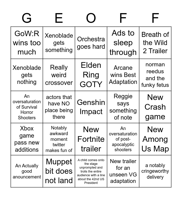 This bingo card has a free space and 24 words: Notably awkward moment twitter makes fun of, Muppet bit does not land, Elden Ring GOTY, An Actually good anouncement, Breath of the Wild 2 Trailer, GoW:R wins too much, Xenoblade gets nothing, Xenoblade gets something, Reggie says something of note, New Fortnite trailer, Arcane wins Best Adaptation, An oversaturation of Survival Horror Shooters, An oversaturation of post-apocalyptic shooters, New Among Us Map, Really weird crossover, New trailer for an unseen VG adaptation, New Crash game, Orchestra goes hard, norman reedus and the funky fetus, actors that have NO place being there, a notably cringeworthy delivery, Xbox game pass new additions, Ads to sleep through and A child comes onto the stage unprompted and trolls the entire audience with a line about the 42nd US President.