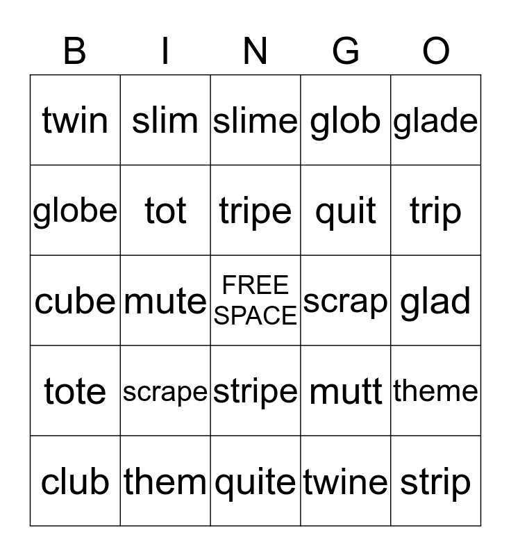 This bingo card has a free space and 24 words: scrape, them, tripe, club, glade, twin, globe, slim, scrap, stripe, quit, cube, mutt, theme, tot, twine, glad, slime, trip, mute, strip, tote, glob and quite.