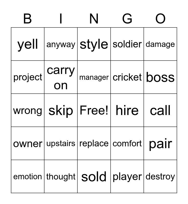 This bingo card has a free space and 39 words: catch, downtown, nervous, carry on, emotion, replace, manager, job, damage, owner, skip, soldier, destroy, call, hire, upstairs, skill, yell, look for, comfort, project, sold, cricket, boss, fell apart, above, bat, buy, practice, anyway, be here soon, division, style, thought, player, something, pair, wrong and luck.