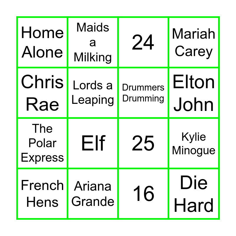 This bingo card has 46 words: Turtle Doves, French Hens, Calling Birds, Gold Rings, Geese a Laying, Swans a Swimming, Maids a Milking, Ladies Dancing, Lords a Leaping, Pipers Piping, Drummers Drumming, Mariah Carey, Wham!, Pogues ft Kirsty Maccoll, Band Aid, Michael Buble, Elton John, Ariana Grande, Wizzard, Chris Rae, Kylie Minogue, The Grinch, Home Alone, The Polar Express, Love Actually, Elf, Nativity, Miracle on 34th Street, A Christmas Carol, Die Hard, Jack Frost, The Snowman, Narnia: lion, witch, wardrobe, 13, 14, 15, 16, 17, 18, 19, 20, 24, 25, 21, 22 and 23.