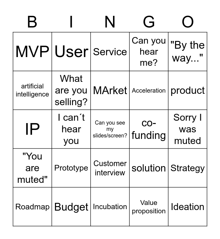This bingo card has 41 words: Free!, IP, Competition, What are you selling?, Budget, Customer interview, MArket, Simon being impatient, "By the way...", "You are muted", I can´t hear you, Can you hear me?, Can you see my slides/screen?, Sorry I was muted, co-funding, Prototype, PoC, MVP, Product, Service, Strategy, Ideation, Incubation, Acceleration, Transition, R&D, Value proposition, Customer buy in, product, 2 min left, Use case, User, Roadmap, Demonstrator/tion, solution, artificial intelligence, hanging fruit, maturity, business model, action and impact.