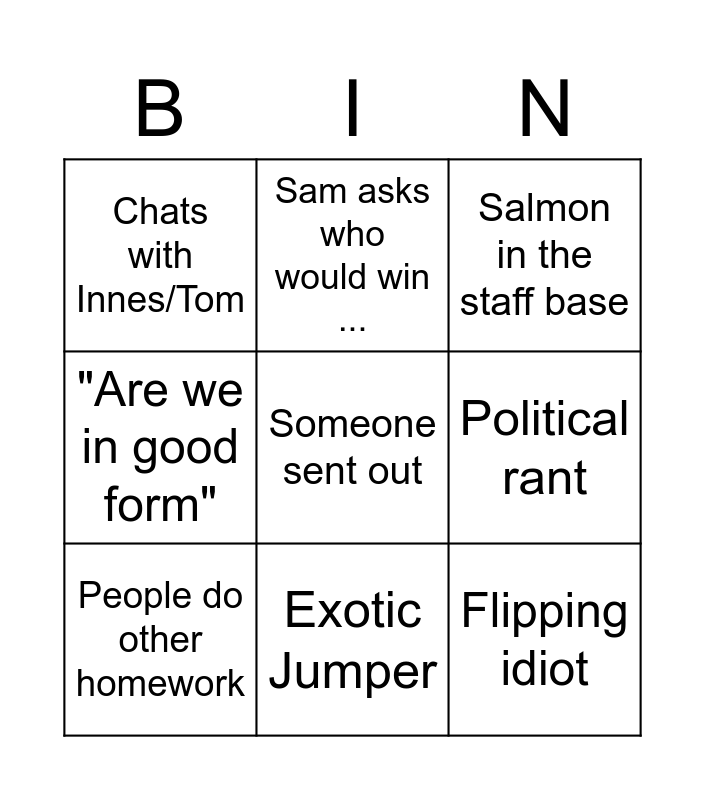 This bingo card has a free space and 26 words: Ruairidh, Shut up Man, Exotic Jumper, Re tell old story, Flipping idiot, Chats with Innes/Tom, Political rant, Sam asks who would win ..., Loses glasses, Fidles with random components, Nathan is late, Innes Doesn't do work, Mr Davidson Forgets about Bingo, chuckles, calabrate bored, Innes has sweets, "Are we in good form", Leaves class, Salmon in the staff base, Youtube plug, Secret life of ..., Innes leaves seat, Phone comes out, "Folks", People do other homework and Back when i was a boy.