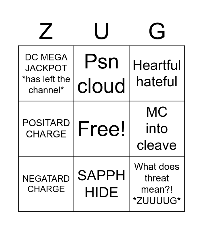 This bingo card has a free space and 8 words: MC into cleave, Heartful hateful, Psn cloud, NEGATARD CHARGE, DC MEGA JACKPOT *has left the channel*, What does threat mean?! *ZUUUUG*, POSITARD CHARGE and SAPPH HIDE.