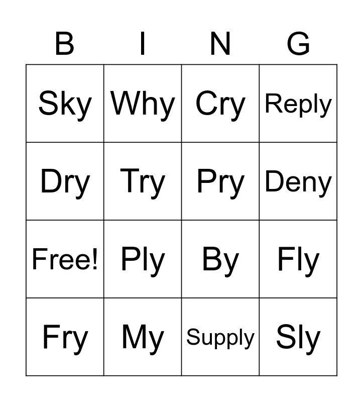 This bingo card has 20 words: Fly, Shy, Cry, Sty, Fry, Dry, My, Sky, Free!, Why, Ply, By, Try, Sly, Pry, Fly, Deny, Reply, Supply and July.