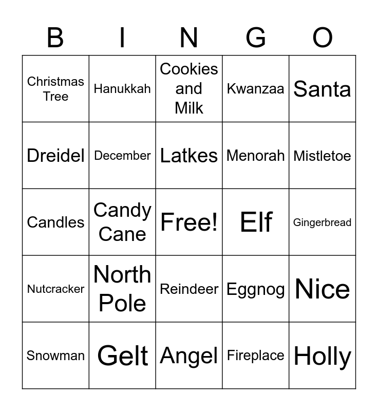 This bingo card has a free space and 31 words: Angel, Jingle Bells, Candy Cane, Christmas, Christmas Tree, Cookies and Milk, December, Eggnog, Elf, Fireplace, Gingerbread, Holly, Hot Chocolate, Jock Frost, Mistletoe, Naughty, Nice, North Pole, Nutcracker, Reindeer, Santa, Winter, Snowman, Hanukkah, Menorah, Dreidel, Kwanzaa, Candles, Gelt, Latkes and Chocolate Coins.