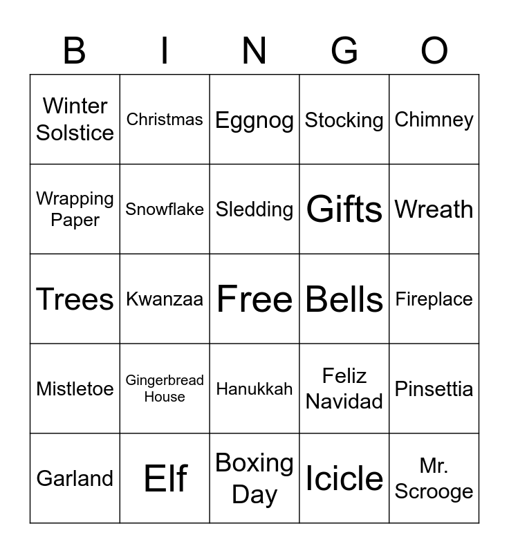 This bingo card has a free space and 49 words: Mittens, Mr. Scrooge, Reindeer, Boxing Day, Gingerbread House, Santa Claus, Christmas, Nutcracker, Wrapping Paper, Grinch, Snowflake, Stocking, Pinsettia, Feliz Navidad, Snow, Lights, Sledding, Bells, Angels, Chimney, Kwanzaa, Icicle, Winter Solstice, Gifts, Ho, Ho, Ho, Wreath, Garland, Star, Hanukkah, Mistletoe, Workshop, Ornaments, Candy Cane, Jolly, Elf, Cookies, Noel, Menorah, Fireplace, Hot Chocolate, Carolers, North Pole, Rudolph, Nativity, Trees, Eggnog, Tinsel, Advent and Druid.